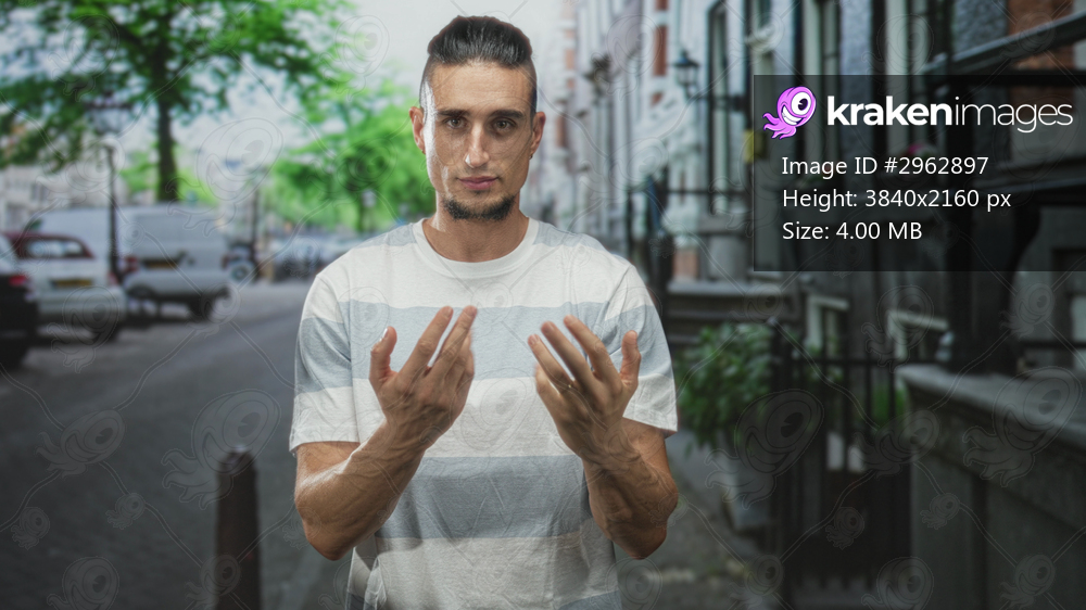 Man with palms open and slightly raised, wearing striped t shirt, standing on a city street with parked vans and iron railings; invitation calm.