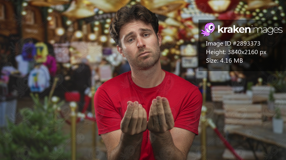 Man with palms pressed together pleading on street near market stalls and rope barriers under warm string lights, wearing red shirt; regret.