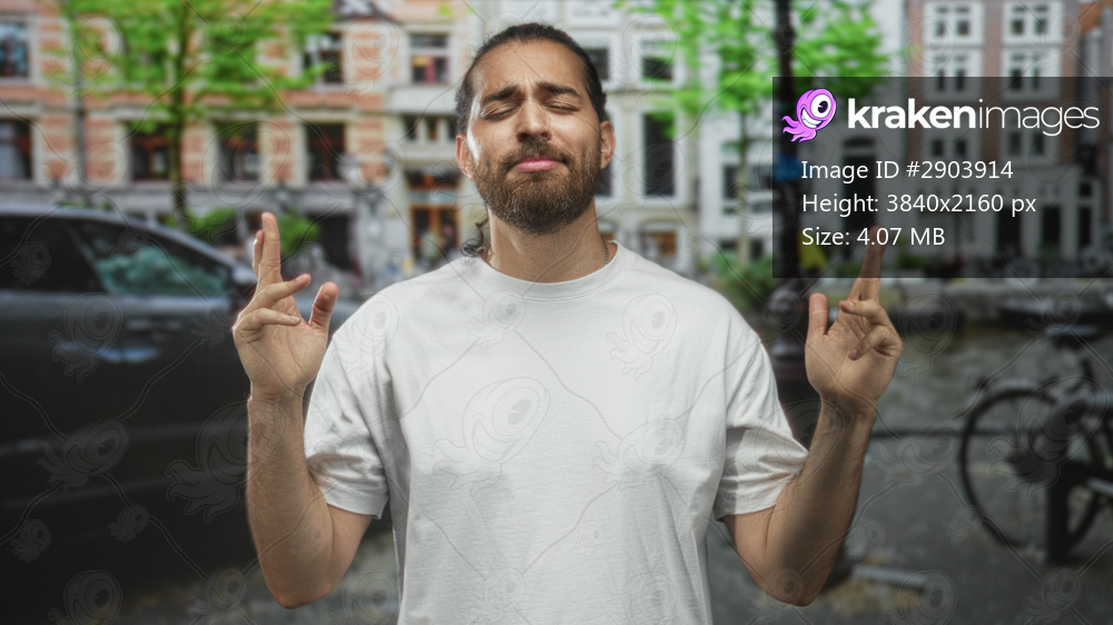 Man with palms pressed together praying, eyes closed and smiling slightly, wearing white tshirt and beard, standing on street by canal and bicycle in amsterdam; serenity. - Kraken Images
