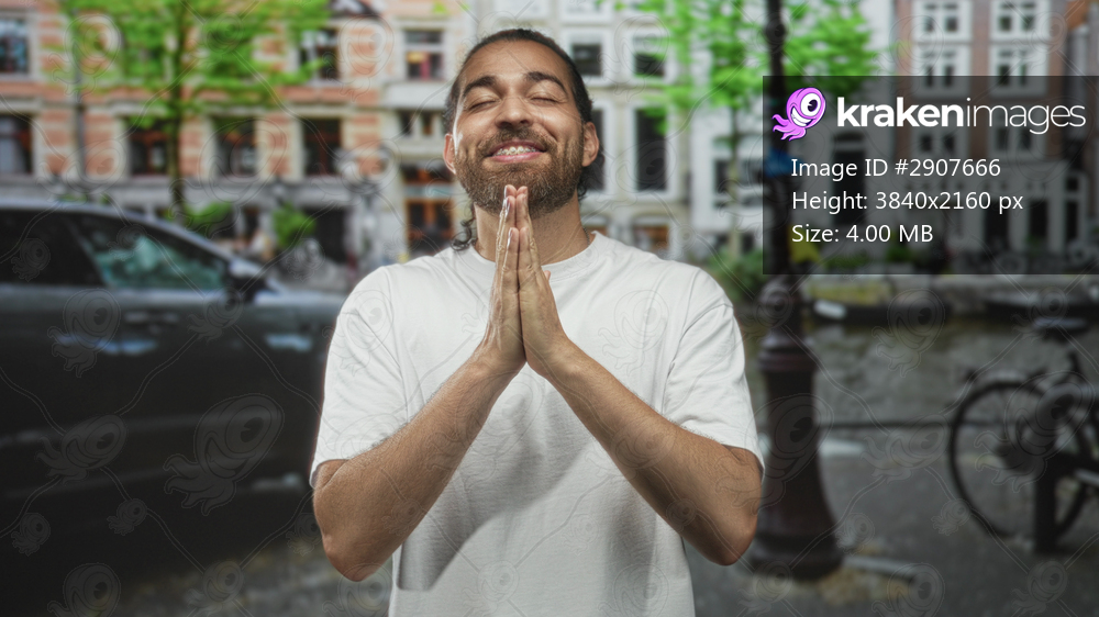 Man with palms pressed together praying, eyes closed and smiling slightly, wearing white tshirt and beard, standing on street by canal and bicycle in amsterdam; serenity. - Kraken Images