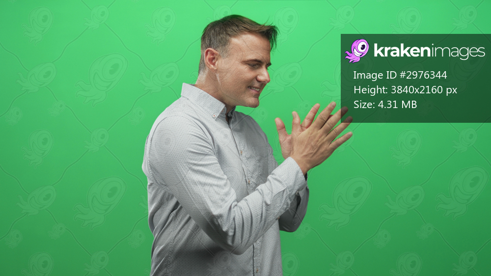 Man with palms pressed together, smiling and looking sideways in a green studio midmotion clasping hands while wearing a collared buttonup shirt; anticipation focus. - Kraken Images