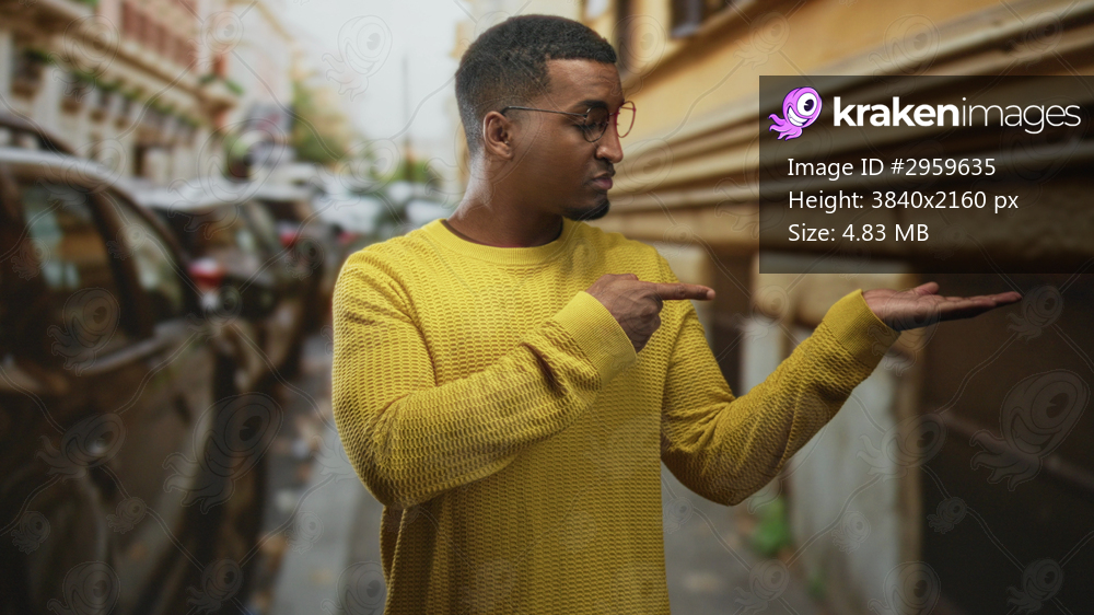 Man with palms up and a questioning shrug on a city street beside a building wearing a yellow sweater and glasses; curiosity questioning.