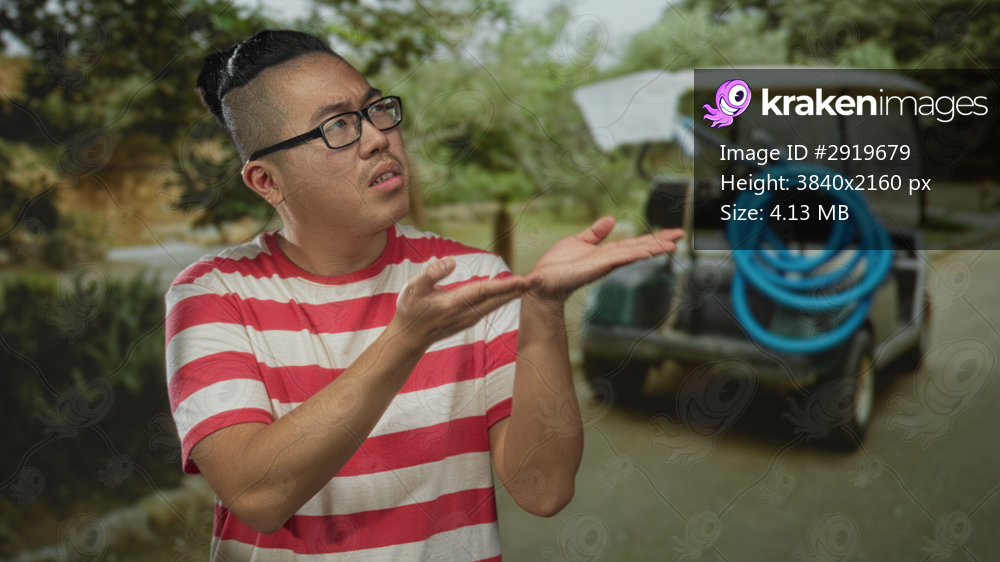 Man with palms up gesture in street beside a parked golf cart and coiled hose; confusion questioning uncertainty.
