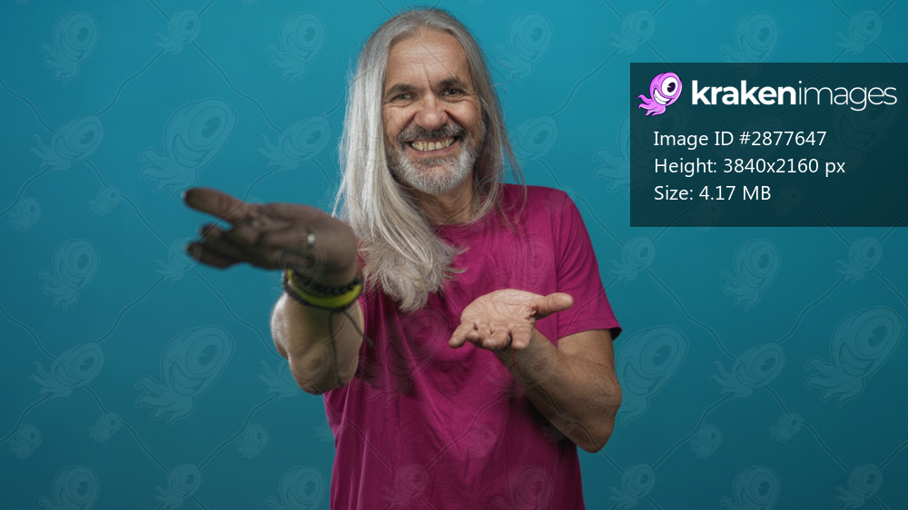 Man with palms up presenting open hands in a teal studio, long silver hair, bracelets and casual tshirt visible; openness joy.