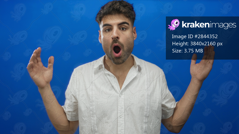 Man with parted lips turning head over shoulder in blue studio setting wearing white shirt; curiosity.