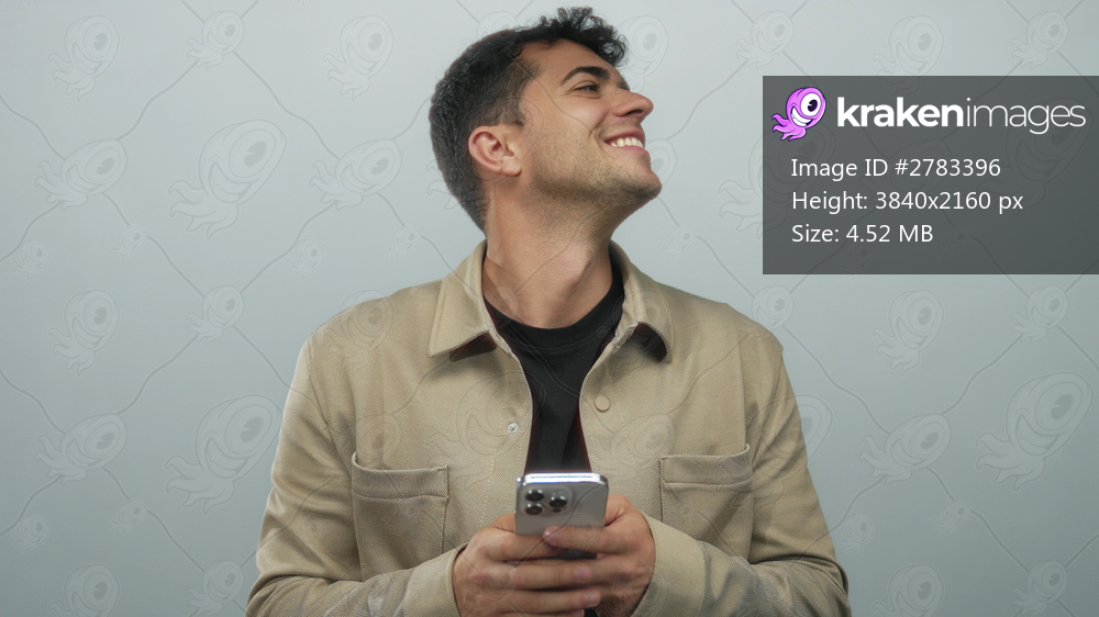 Man phone holding background shot shows smartphone by young hispanic actor in colored neutral environment smiling.