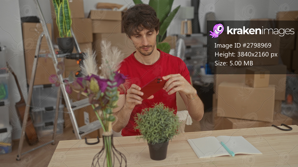 Man photographing floral arrangement on wooden table with red smartphone in new home amid moving boxes; focus.