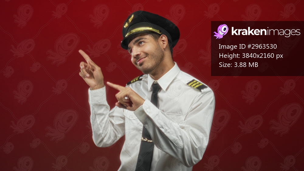 Man pilot in airline uniform pointing with fingers and smiling, cap and epaulettes visible in a red studio setting; cheerful playful confidence.