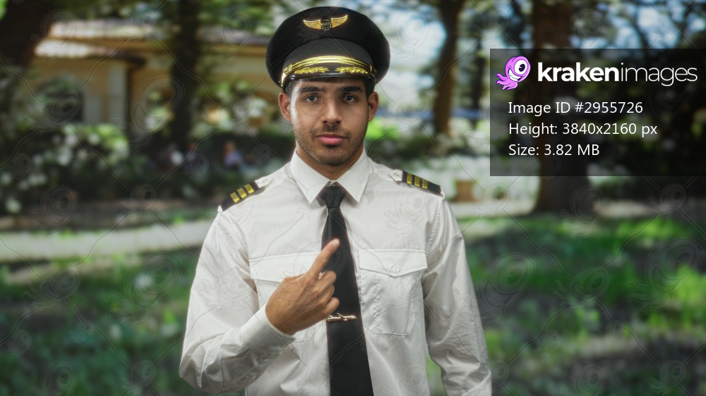 Man pilot in uniform adjusting cap and straightening black tie by a building and trees in forest; confidence duty readiness.