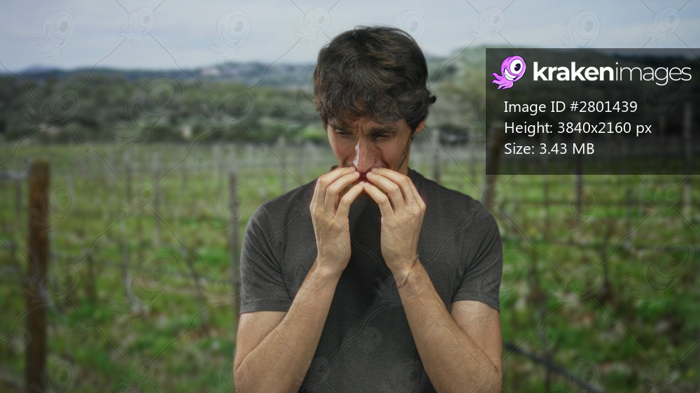 Man pinches nose with both hands in green forest clearing among vineyard rows under cloudy sky; disgust.