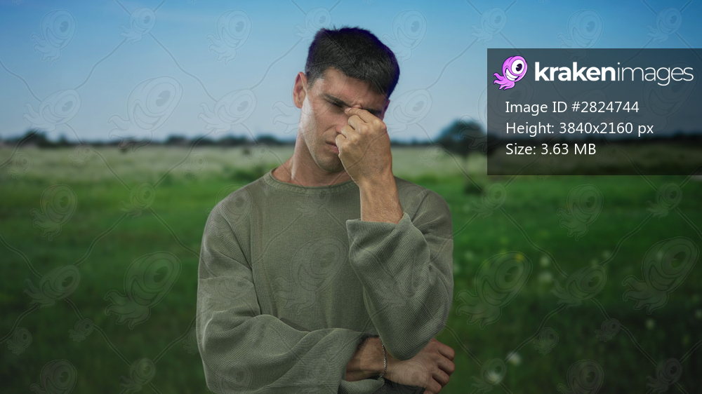 Man pinches nose and crosses bare arms in green open park outdoors under bright blue sky with sunlight; disgust.