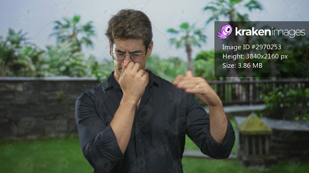 Man pinches nose with hand at building courtyard among palm trees and stone wall; disgust reaction outdoor.