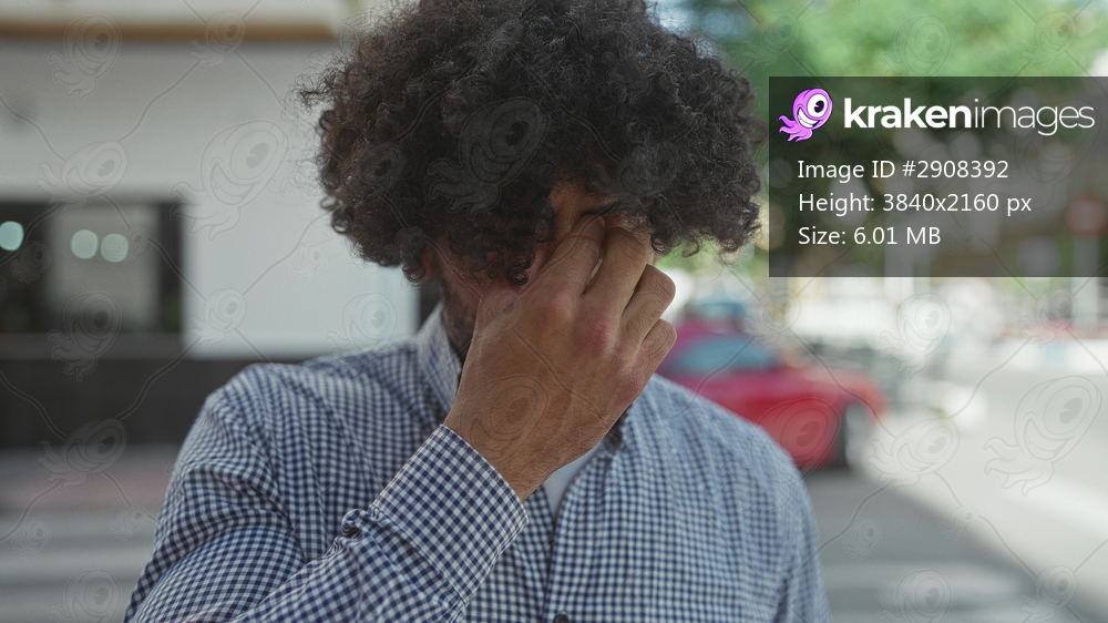 Man pinches nose with hand on busy city street crosswalk, curly hair covering eyes, checkered shirt visible; discomfort smell.