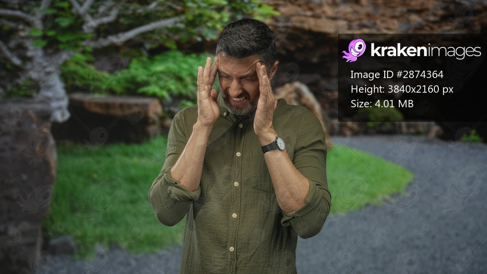 Man pinches nose and presses temples on a forest path with hands near face and wristwatch visible; discomfort solitude.
