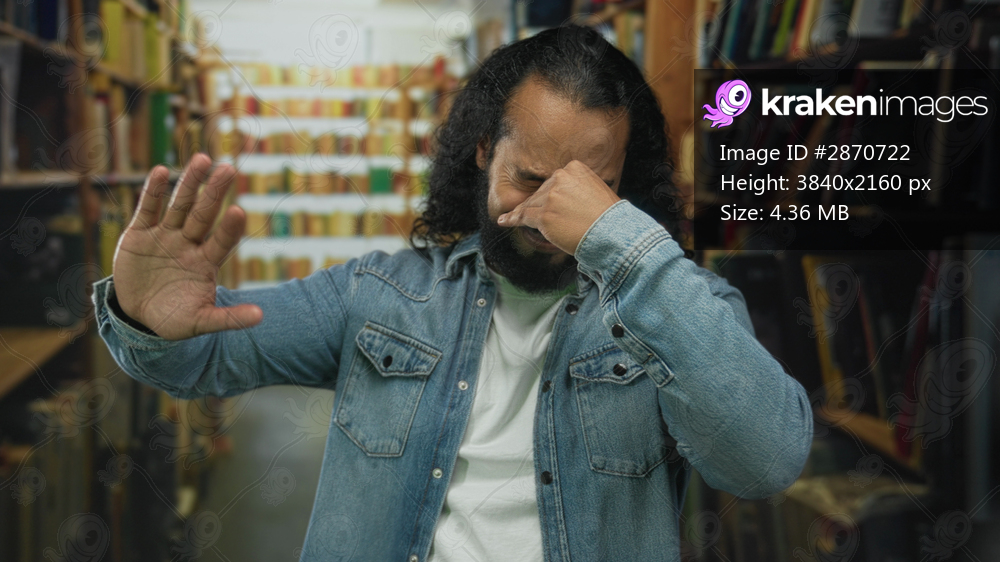 Man pinches nose and raises hand among tall library shelves in a building aisle; disgust odor annoyance.