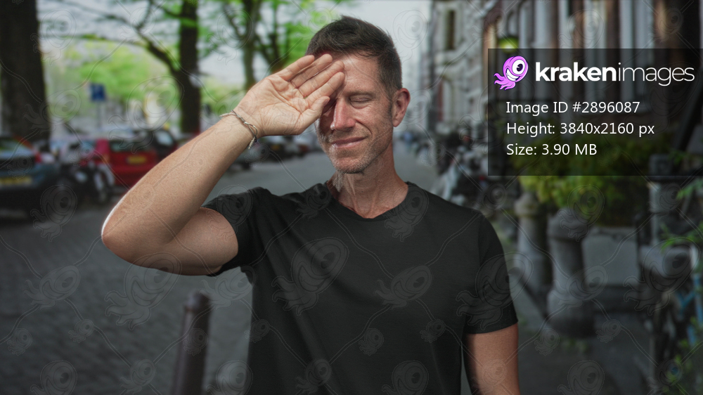 Man pinches nose and shields eyes with hand on a city street lined with bicycles and parked cars; disgust.