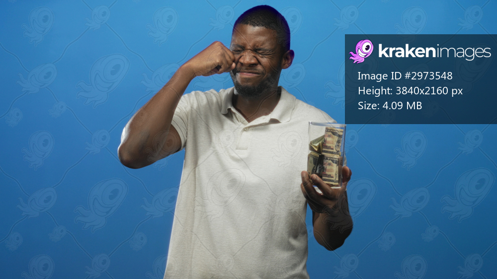 Man pinches nose while holding a clear jar of dollar bills in studio, grimacing at the smell and showing discomfort; disgust.