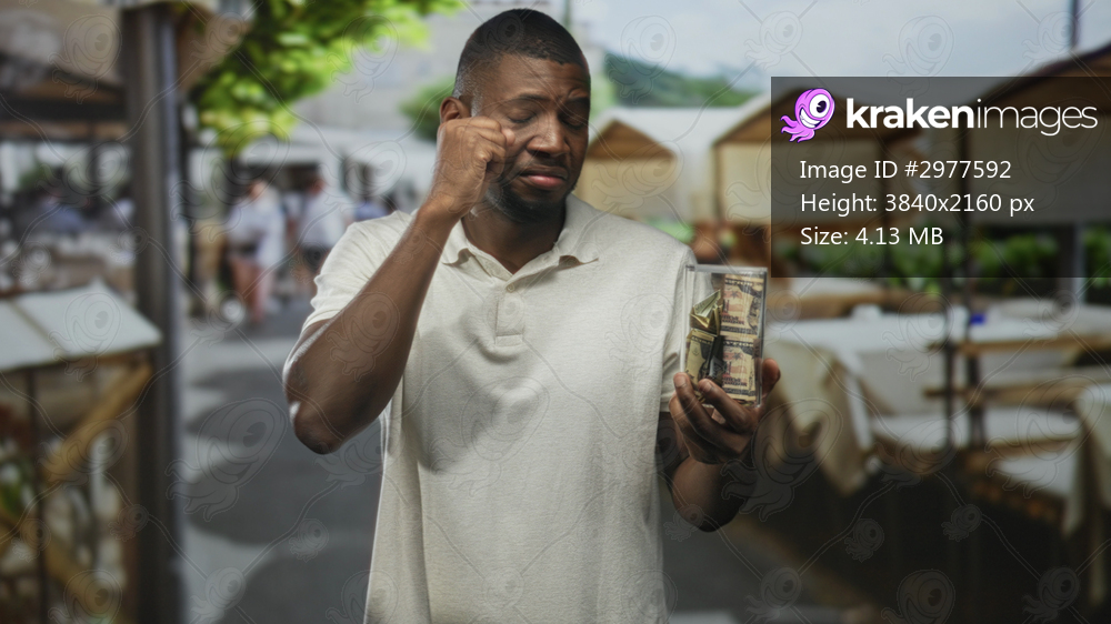 Man pinches nose while holding a glass tip jar filled with bundled dollars at a busy street cafe, showing a wince and closed eyes; disgust concern.