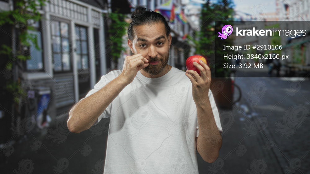 Man pinches nose while holding a red apple on a busy city street near shops and planters; disgust doubt.