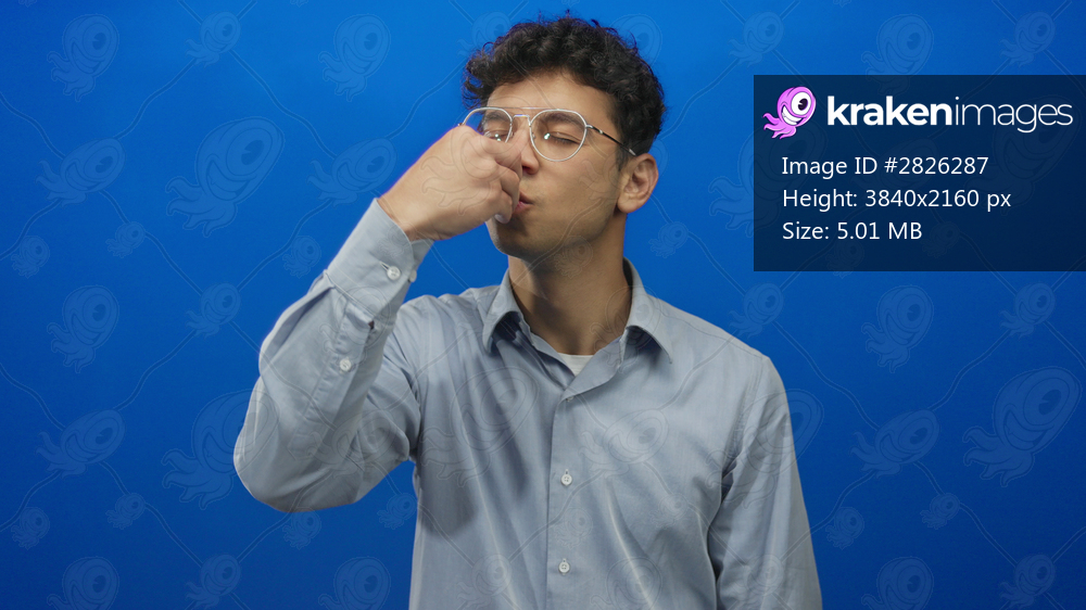 Man pinches nose while standing before a vibrant blue studio wall during a sensory smell test of unpleasant odor; disgust.