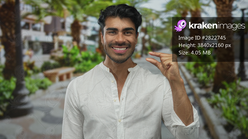 Man pinches thumb and index finger in a green park with palm trees and benches; precision measurement.