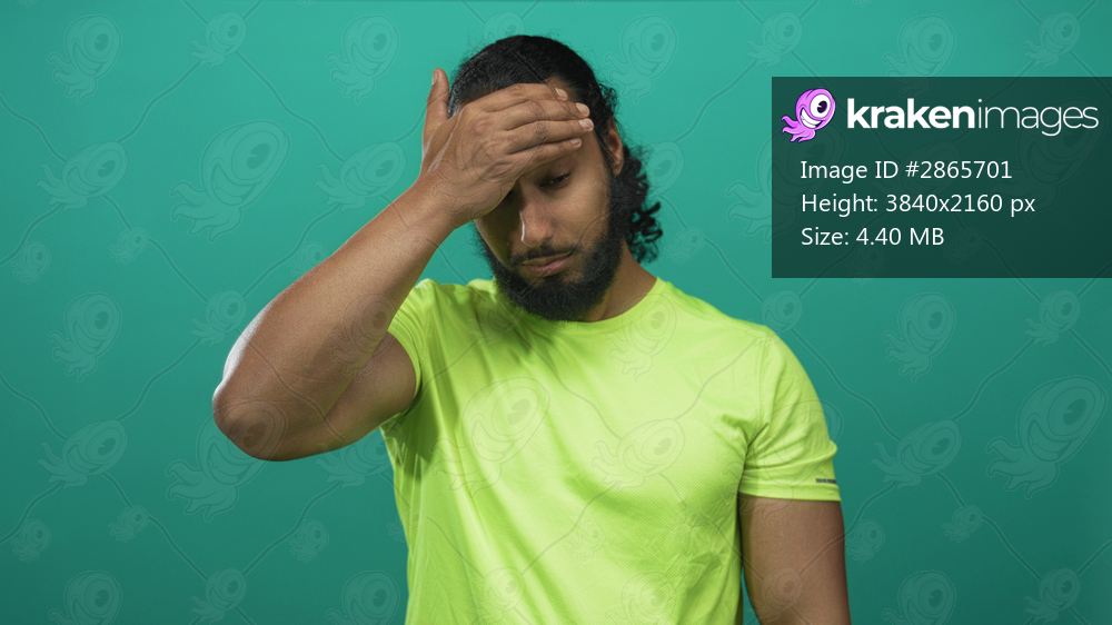 Man pinching bridge of nose in studio with teal backdrop and neon green tshirt, hand covering eyes in weary pose; stress fatigue recovery.