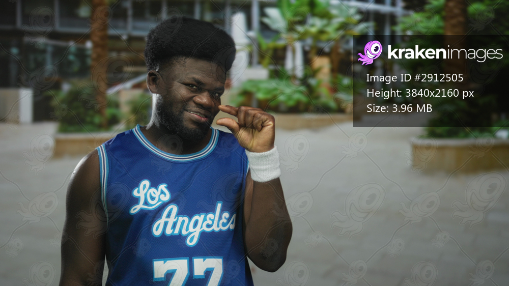 Man pinching fingers beside face in front of a building plaza, wearing blue basketball jersey; playful confidence.