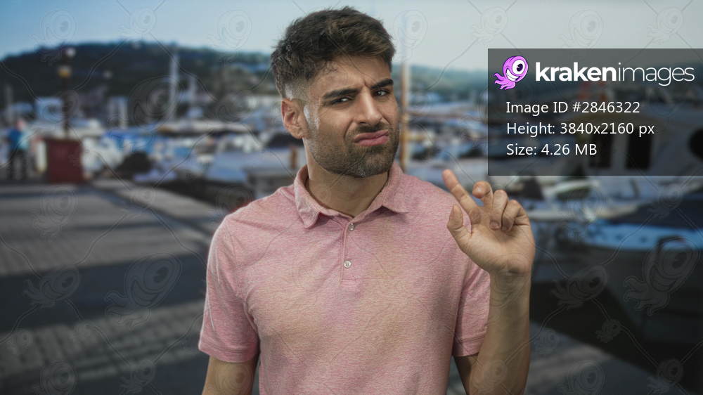 Man pinching fingers next to moored boat on street dock under bright sunlight, expression shows doubt; skepticism.