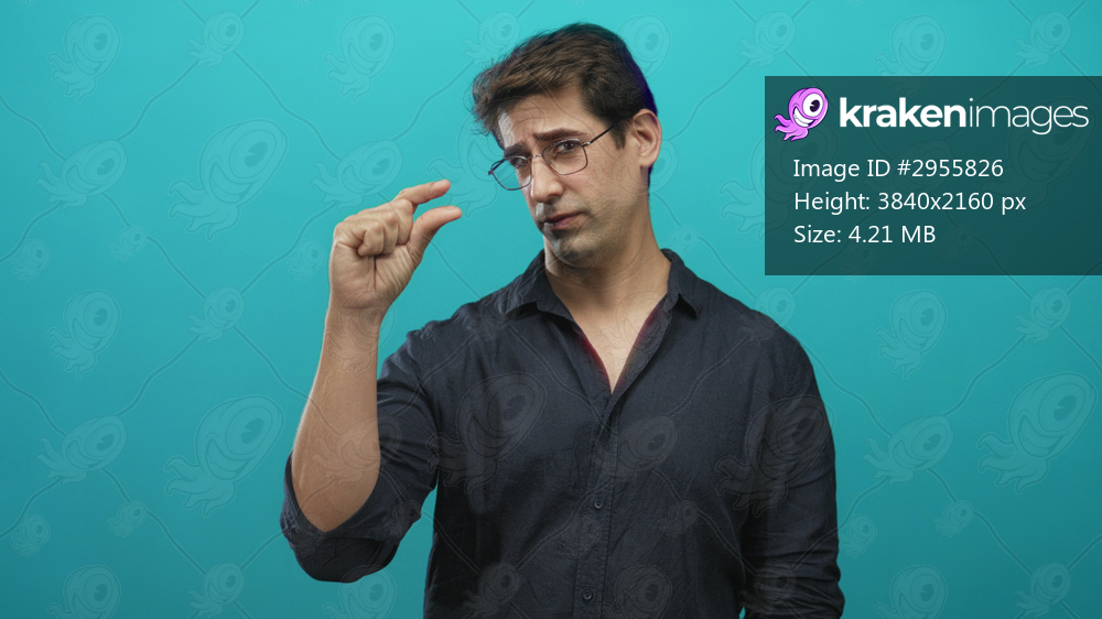 Man pinching fingers to show a tiny amount, wearing glasses and dark shirt against a turquoise studio backdrop with soft lighting; skepticism.