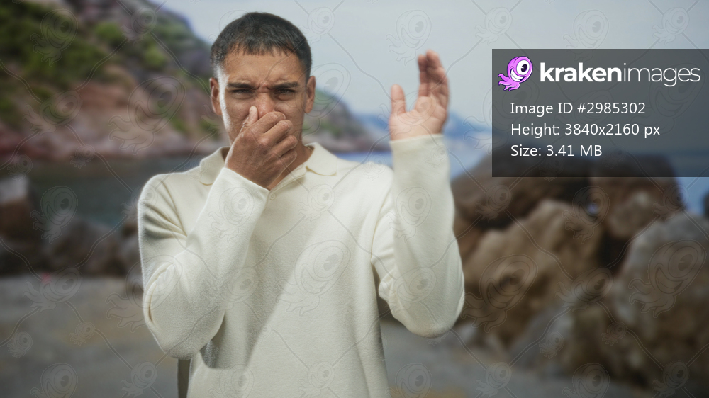 Man pinching nose with hand and grimace, raising other hand away, in a studio set showing a rocky beach; disgust.