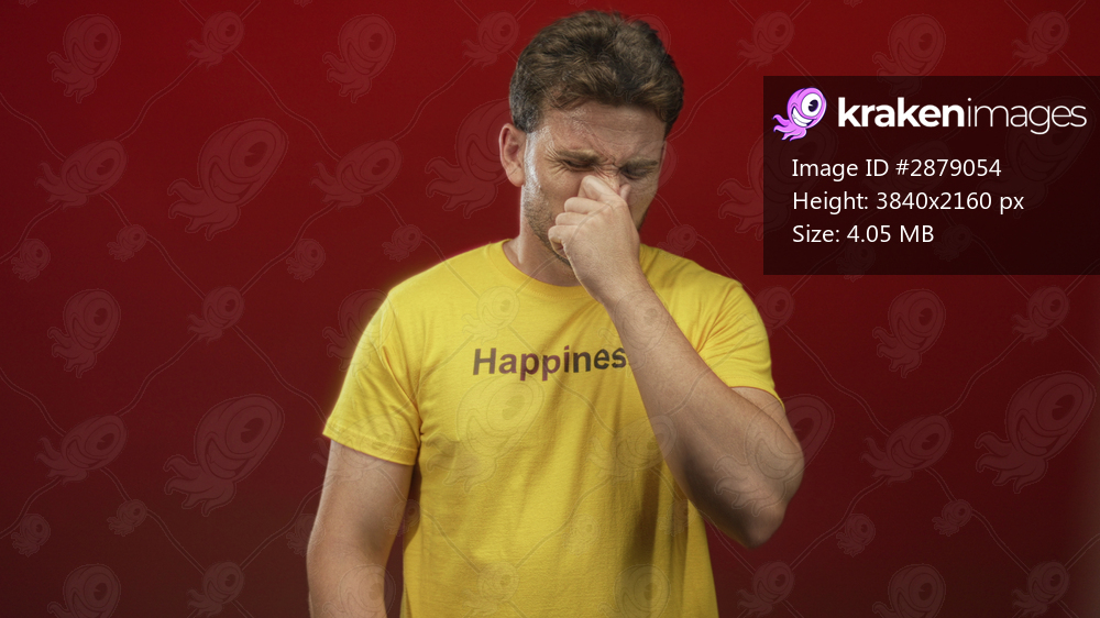 Man pinching nose with hand wearing yellow t shirt in red studio, grimacing face; disgust odor smell discomfort.