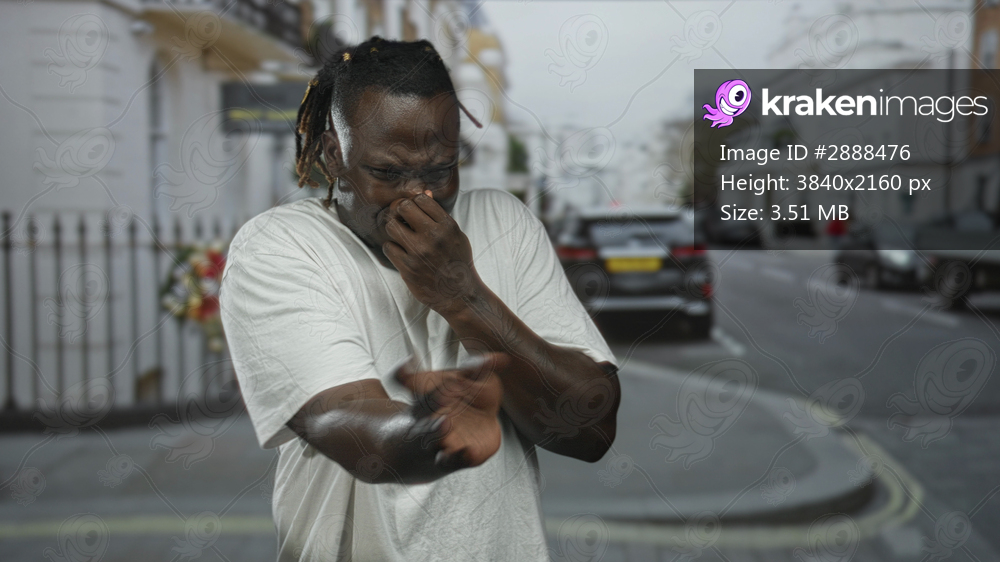 Man pinching nose on city street curb with hand to face, wearing white t shirt near parked cars and iron railings; disgust discomfort odor.