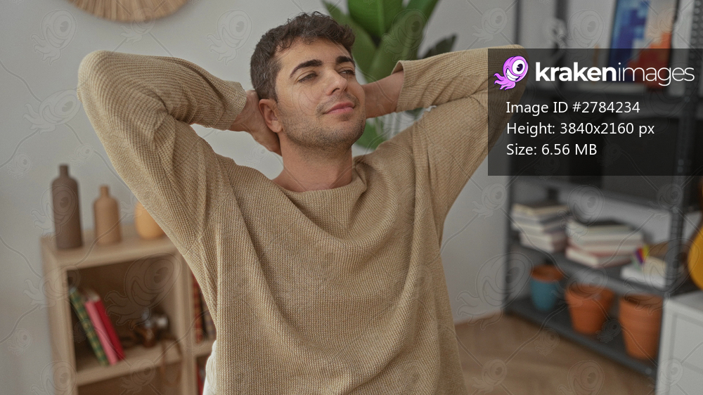 Man places arms behind head, leaning at home as a young hispanic guy enjoying indoor comfort and calm.