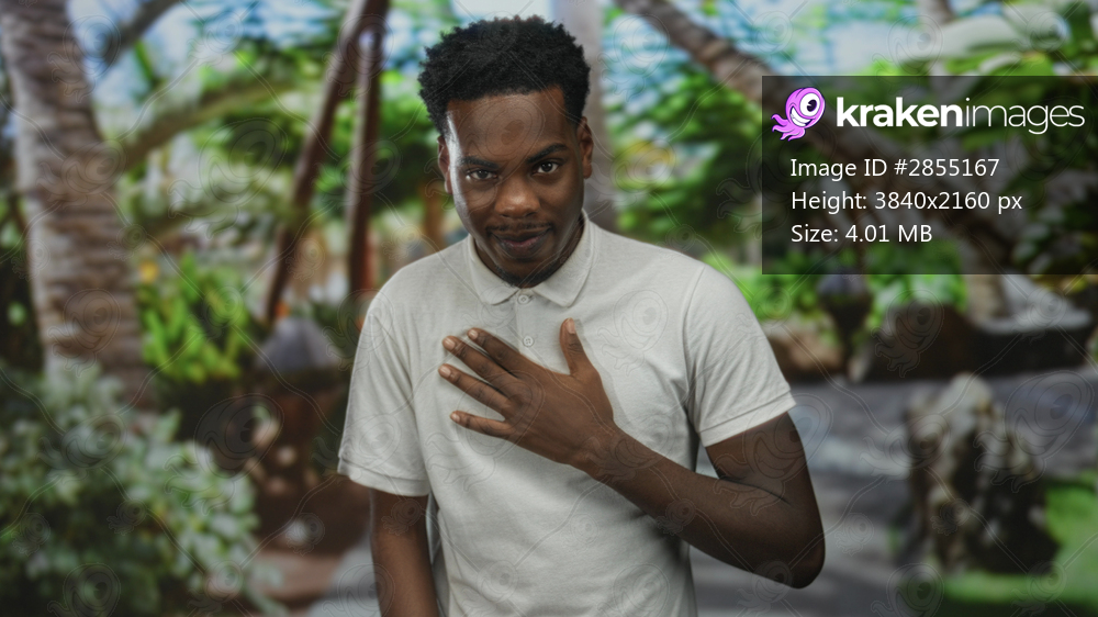 Man places hand on chest with a sincere expression under lush green foliage in forest; gratitude trust.