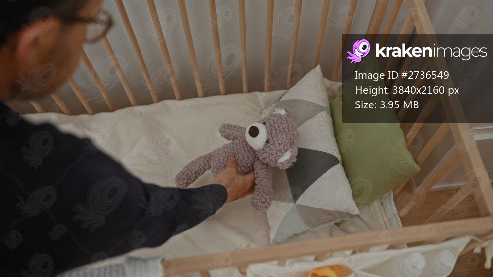 Man placing teddy bear in crib within cozy bedroom setting, highlighting nurturing atmosphere in modern family home interior.