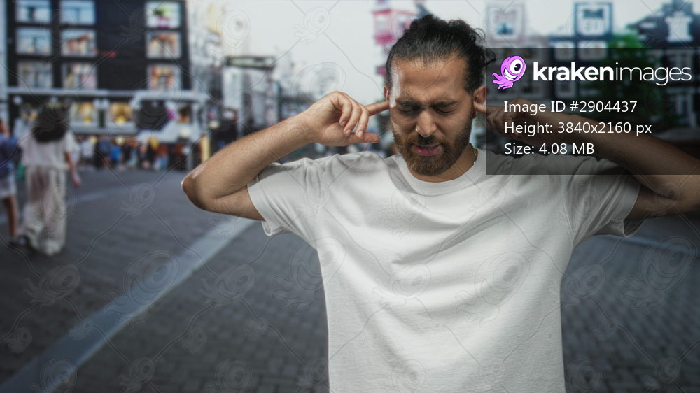 Man plugging ears with fingers on a crowded city street, grimacing against loud traffic and chatter; annoyance sensory overload.