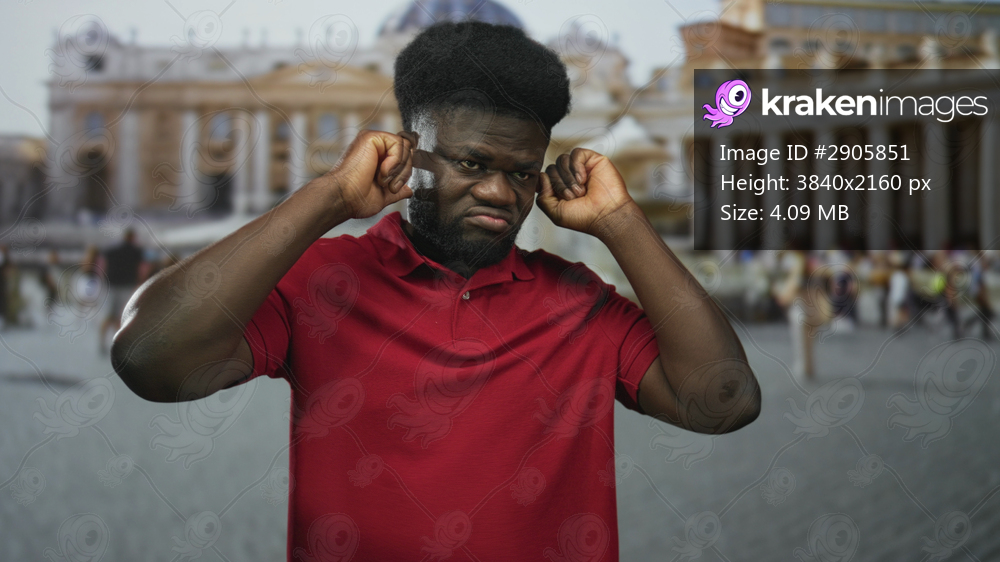 Man plugs ears with fingers at a building in saint peter square near the vatican, wearing red polo and grimacing while crowd blurs behind; annoyance.