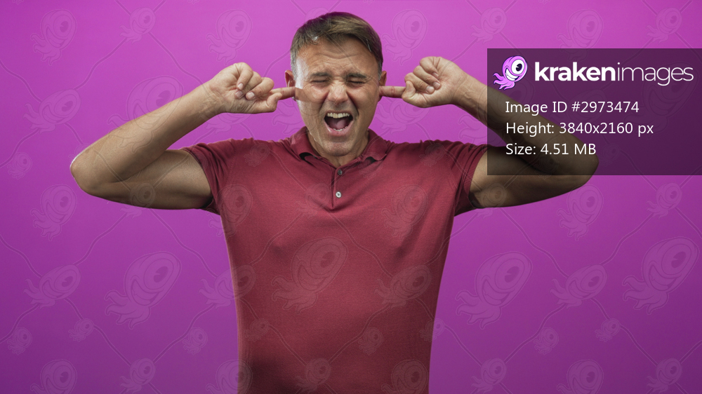 Man plugs ears with fingers, eyes closed and mouth open while wearing maroon polo in studio; annoyance.