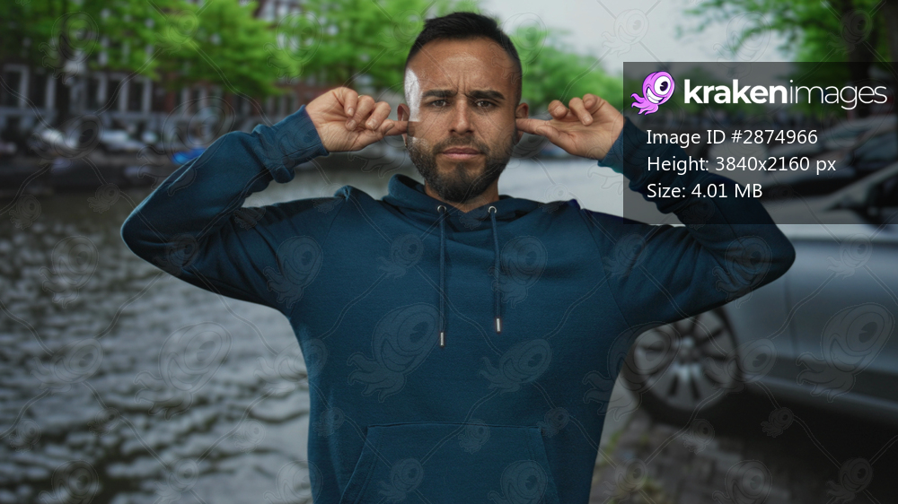 Man plugs ears with fingers on street by amsterdam canal, grimacing and mouth open as if shouting at traffic; frustration overload.