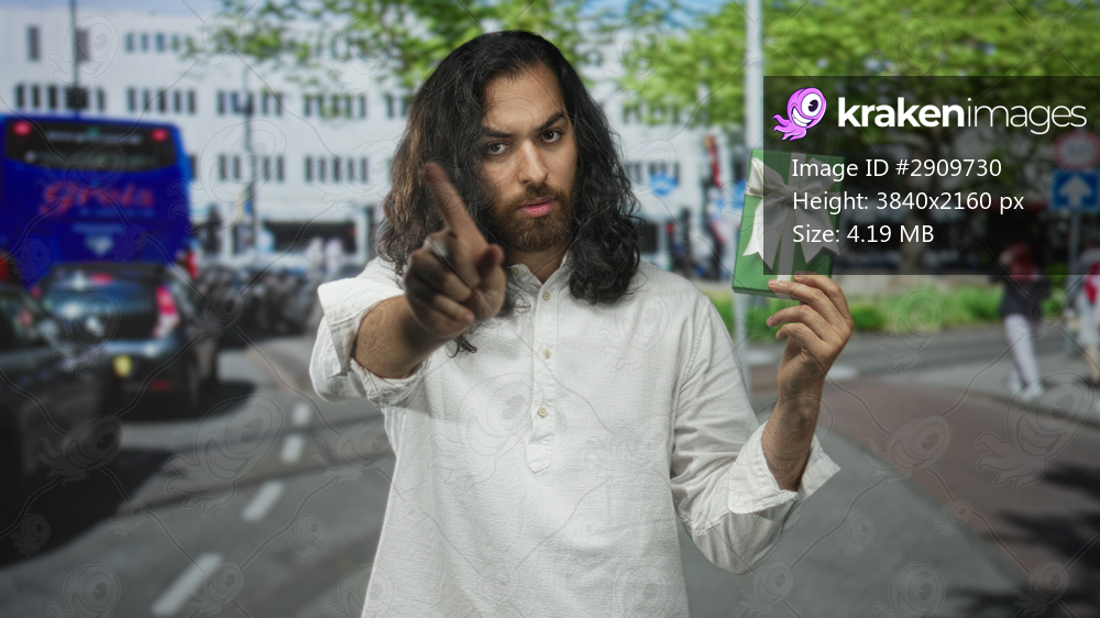 Man pointing at a green gift box on a busy city street, holding it up amid traffic and cyclists while studying the ribbon; curiosity gift discovery.
