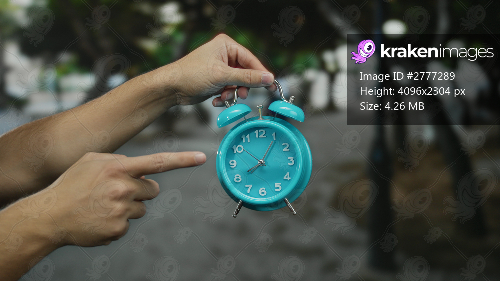 Man pointing at blue alarm clock outdoors on city street highlighting time or reminder concept.