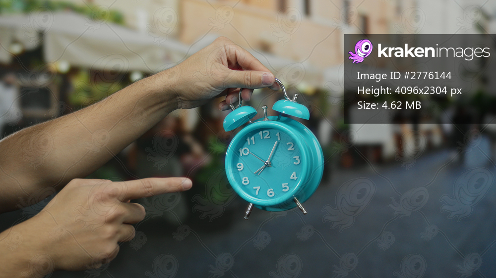 Man pointing at turquoise alarm clock in market street, suggesting time awareness in a vibrant outdoor setting with blurred stalls and people in the background. - Kraken Images