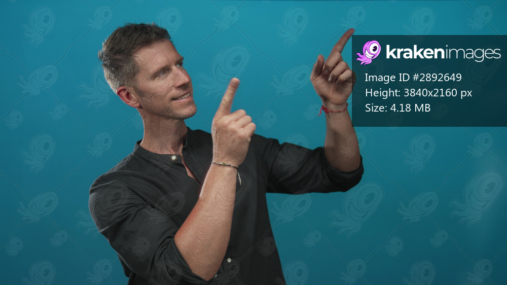 Man pointing both fingers outward in teal studio showing bare hands and forearms, wearing dark shirt and bracelet, smiling slightly; confidence.
