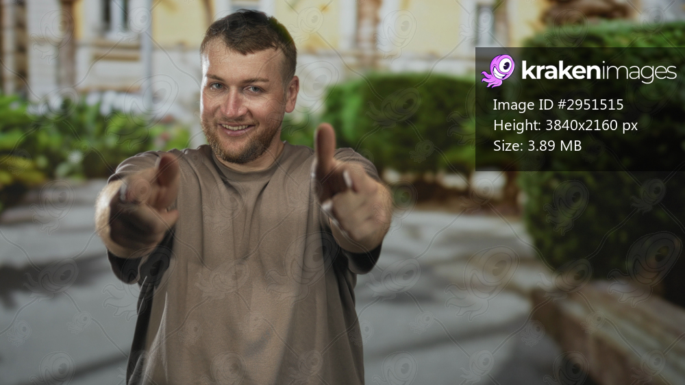 Man pointing both hands and fingers at camera on street near building, smiling broadly; cheerful greeting.