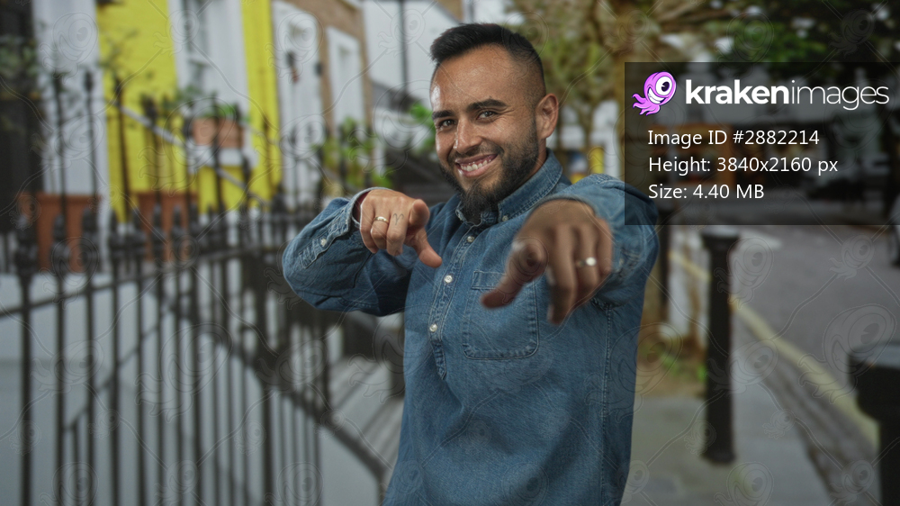 Man pointing both hands and fingers toward camera on a city street wearing denim shirt and rings, smiling at viewer; confidence playfulness charm.