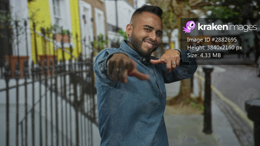 Man pointing both hands and fingers toward camera on a city street wearing denim shirt and rings, smiling at viewer; confidence playfulness charm.