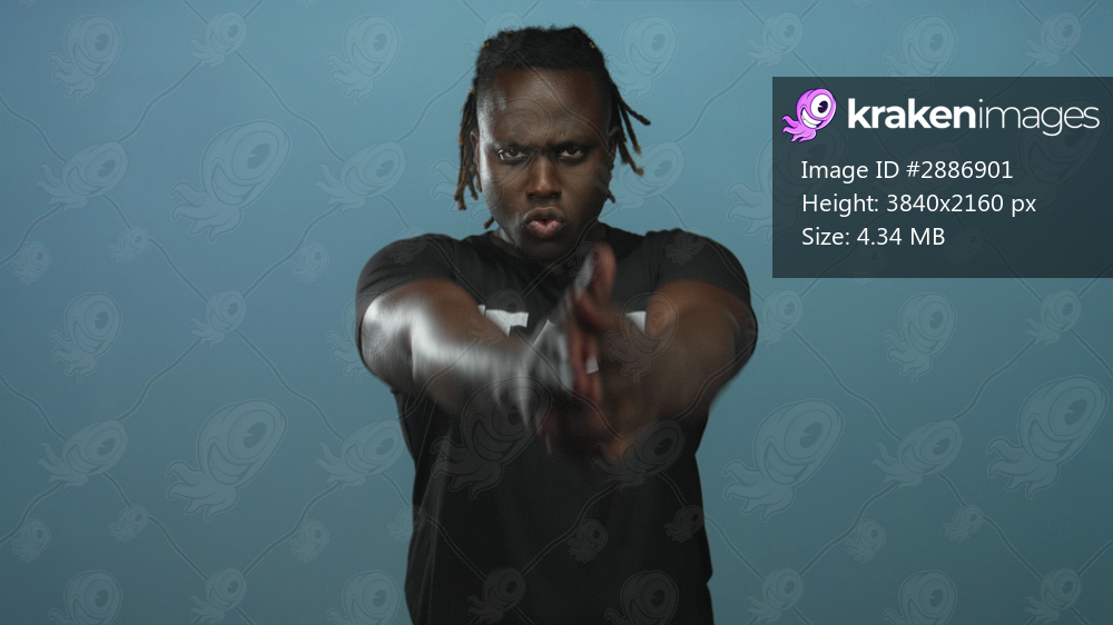 Man pointing both hands forward in blue studio with intense stare and black staff t shirt visible; determination.