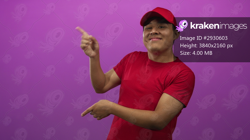 Man pointing with both hands in studio wearing delivery cap and red shirt on purple studio wall; playful service.