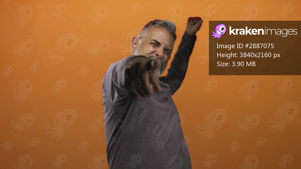 Man pointing with both hands and raising a fist in an orange studio; energetic confident celebration.