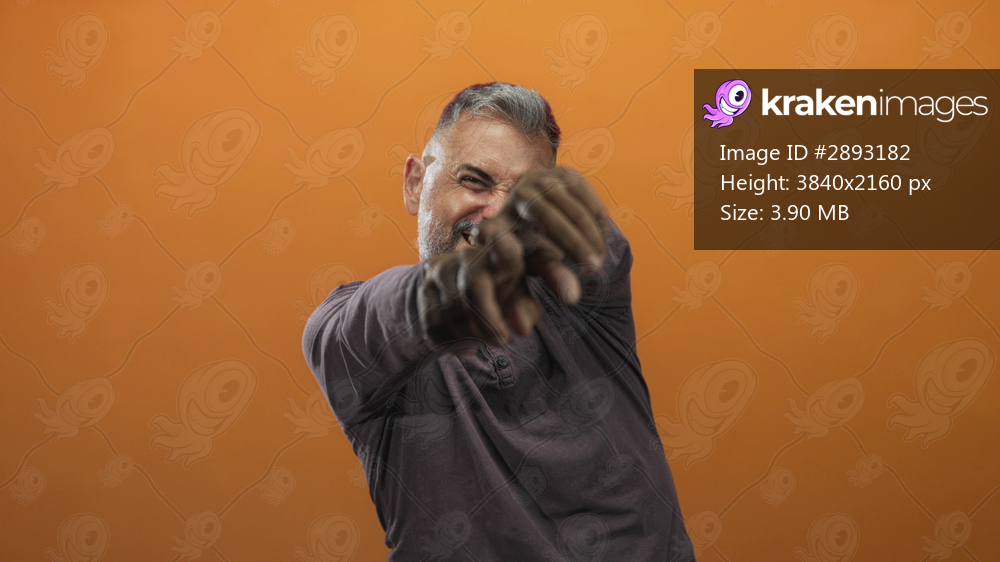 Man pointing with both hands and raising a fist in an orange studio; energetic confident celebration.